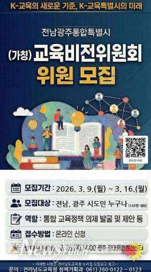 뉴스펀치 박세훈 기자 | 전라남도교육청이 전남․광주 통합교육 정책을 발굴․제시하는 ‘(가칭) 전남광주교육행정통합 교육비전위원회’를 구성·운영키로 하고, 16일까지 전남광주 시도민 위원 100여 명을 공개 모집한다.