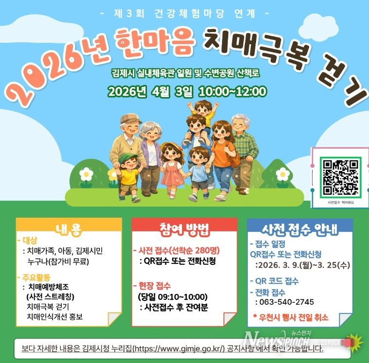 뉴스펀치 최영남 기자 | 김제시 치매안심센터는 치매에 대한 올바른 인식 확산과 치매친화적 지역사회 조성을 위해 '2026 한마음 치매극복 걷기 행사'참가자를 모집한다고 밝혔다.