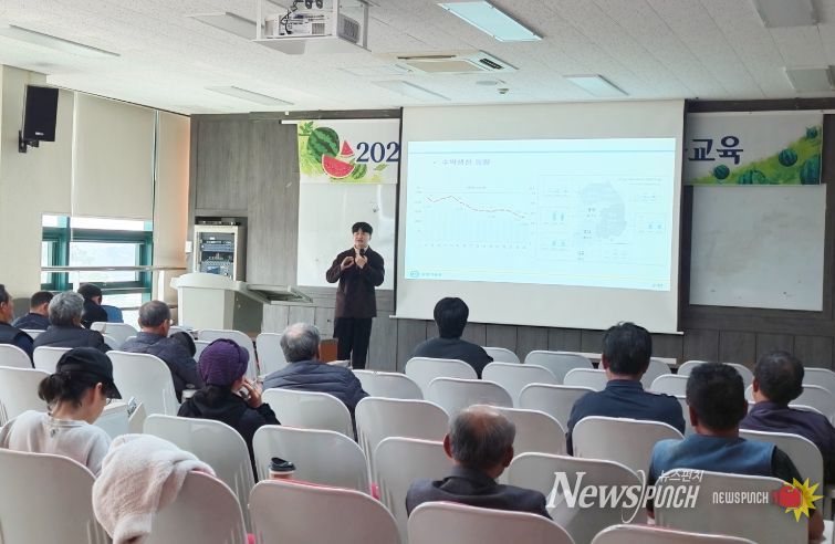 뉴스펀치 최영남 기자 | 정읍시농업기술센터는 지난 10일 제2청사 1강의실에서 관내 수박 재배 농가 30명을 대상으로 ‘고당도 수박 전문 기술 교육’을 실시했다.