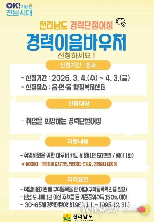 뉴스펀치 최영남 기자 | 여수시는 출산·육아·돌봄 등으로 경력이 단절된 여성의 경제활동 복귀를 지원하기 위해 오는 3월 4일부터 4월 3일까지 ‘경력이음바우처 지원사업’을 추진한다고 밝혔다.