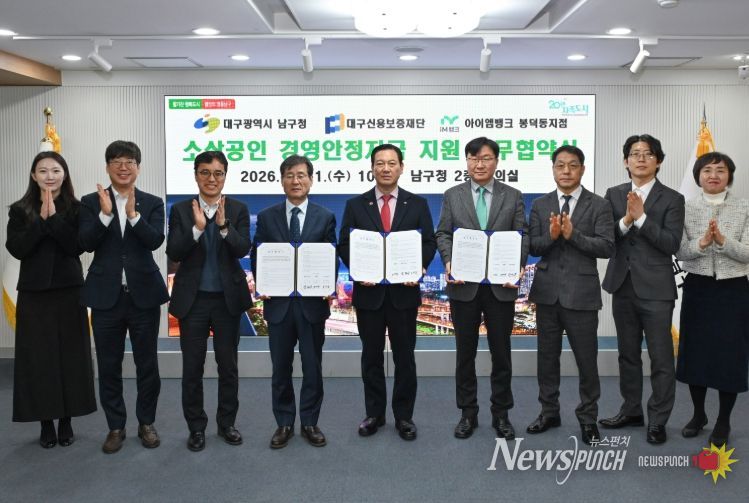 뉴스펀치 조평훈 기자 | 대구 남구는 11일 지역 소상공인들의 경영난 해소를 위해 대구신용보증재단 및 아이엠뱅크 봉덕동지점과 소상공인 경영안정자금 지원 업무협약을 체결했다.
