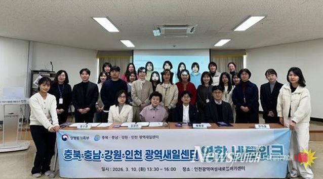 뉴스펀치 조평훈 기자 | (재)인천여성가족재단 인천광역여성새로일하기센터는 2026년 3월 10일 오후 1시 30분, 재단 소강당에서 강원광역여성새로일하기센터, 충북광역여성새로일하기센터, 충남광역여성새로일하기센터와 함께 ‘중부권 광역여성새로일하기센터 연합 네트워크 구축을 위한 다자간 업무협약'을 체결했습니다.