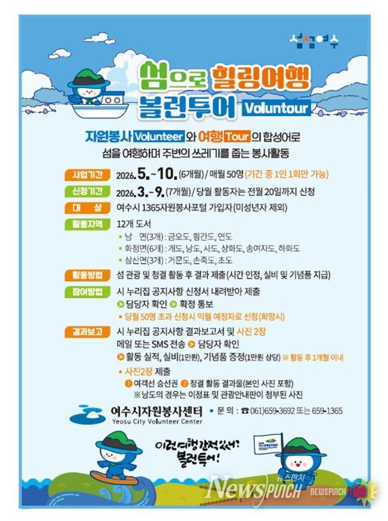 뉴스펀치 최영남 기자 | 여수시가 2026여수세계섬박람회를 앞두고 섬 관광과 자원봉사를 결합한 이색 프로그램인 ‘섬섬여수 볼런투어(Voluntour)’를 오는 5월부터 본격 운영한다고 밝혔다.