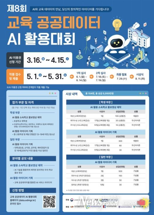 뉴스펀치 최영남 기자 | 전북특별자치도교육청은 교육 공공데이터와 인공지능(AI) 기술을 융합해 현장의 문제를 해결하고, 새로운 데이터 활용 생태계를 조성하기 위해 ‘제8회 교육 공공데이터 AI 활용대회’를 개최한다.