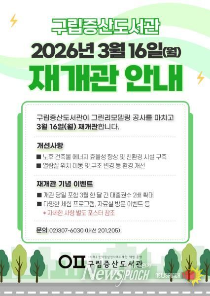 구립증산도서관은 재개관을 기념해 ▲3월 한 달간 대출 권수 확대 ▲디지털 드로잉 교실 ‘내가 그린 도서관의 한 장면’ ▲책놀이 프로그램 ‘내가 만드는 푸른 지구’ ▲인스타그램 이벤트 등 다양한 이용자 참여 행사를 진행할 예정이다.
