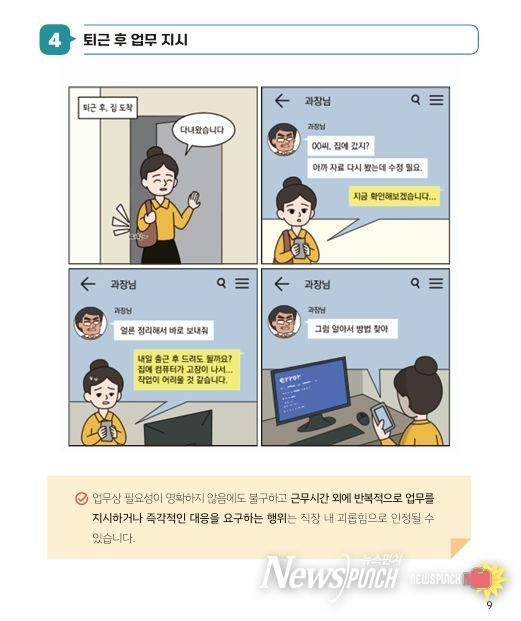 특히 △반복·과도한 지시 △휴가 사용 압박 △업무 편중 △퇴근 후 SNS 업무 지시 △공개적 질책 등 직원들이 실제 업무 환경에서 공감할 수 있는 사례들을 4컷 만화로 풀어내 직원들의 이해도를 높였다.