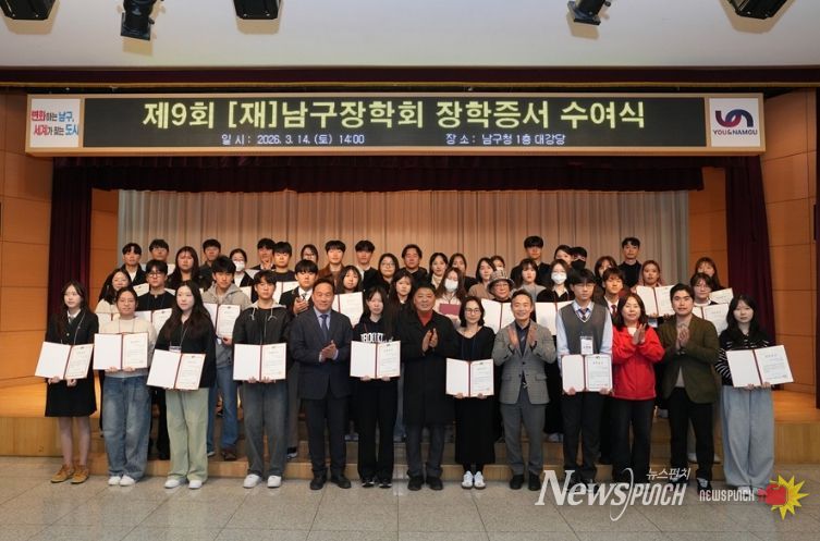 뉴스펀치 김윤걸 기자 | (재)부산광역시 남구장학회(이사장 김태유)는 지난 3월 14일 남구청 대강당에서 장학생과 학부모 등 80여 명이 참석한 가운데 2026년도 남구장학회 장학 증서 수여식을 개최했다.