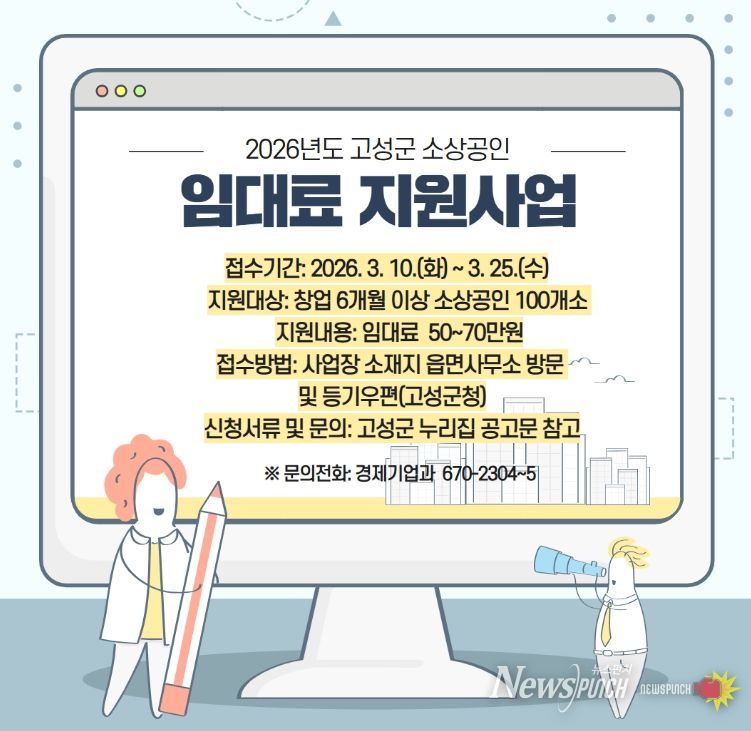 임대료 지원요건은 고성군에 6개월 이상 사업장을 임차해 운영 중인 소상공으로서, 월 임대료 10만원 이상 사업장을 대상으로 신청서류를 접수받아 적격 심사를 거쳐 선정할 계획이며, 지원금은 상반기 내 지급될 예정이다.