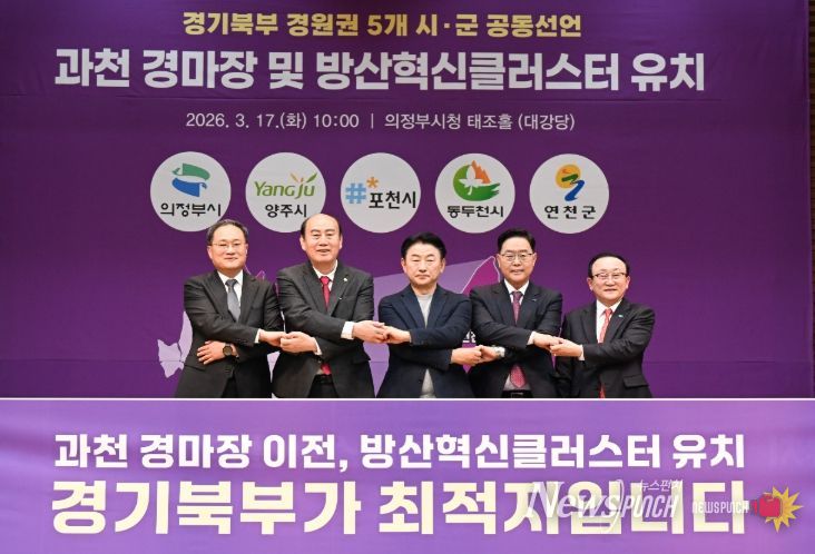 뉴스펀치 박상훈 기자 | 양주시는 17일 의정부시청 대강당에서 의정부·포천·동두천시·연천군과 함께 ‘과천경마공원 이전 및 방산혁신클러스터 경기북부 유치’를 위한 공동 선언문을 발표했다.