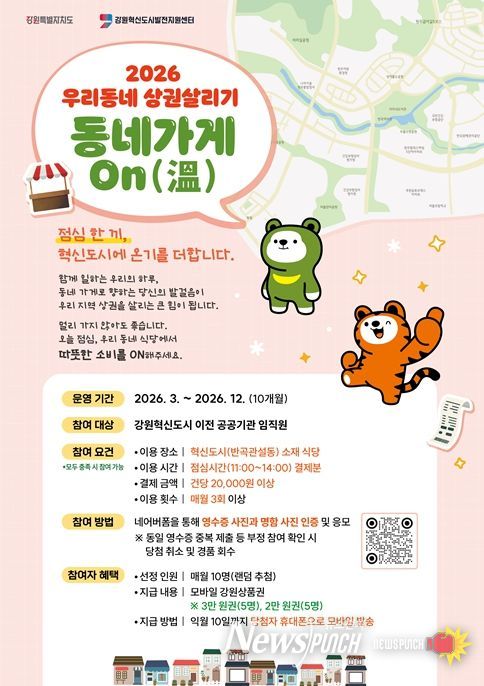 뉴스펀치 조평훈 기자 | (재)강원혁신도시발전지원센터에서는 강원혁신도시 이전 공공기관 임직원을 대상으로 지역 상권 활성화를 위한 ‘2026 우리동네 상권살리기 동네가게 On(溫)’사업을 추진한다고 밝혔다.