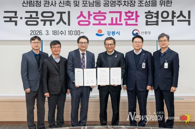 뉴스펀치 조평훈 기자 | 강릉시와 동부지방산림청은 18일 강릉시청에서 포남동 공영주차장 조성을 위한 국·공유지 교환 업무협약을 체결했다.