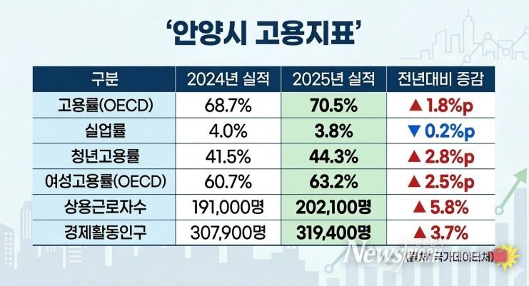국가데이터처에 따르면, 안양시의 지난해 고용률(OECD)은 70.5%로, 전년 대비 1.8%p 상승했으며, 실업률은 3.8%로 집계돼 0.2%p 하락했다.