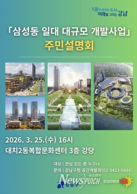 뉴스펀치 박상훈 기자 | 꿈이 모이는 도시, 미래를 그리는 강남구가 오는 3월 25일 오후 4시, 대치2동복합문화센터 3층 강당에서 ‘삼성동 일대 대규모 개발사업 주민설명회’를 개최한다.