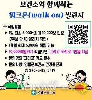 뉴스펀치 조평훈 기자 | 영월군은 지역주민의 걷기 실천을 활성화하고 건강증진을 도모하기 위해 모바일 걷기 앱 ‘워크온(WalkOn)’을 활용한 '2026년 워크온 챌린지'를 운영한다고 밝혔다.
