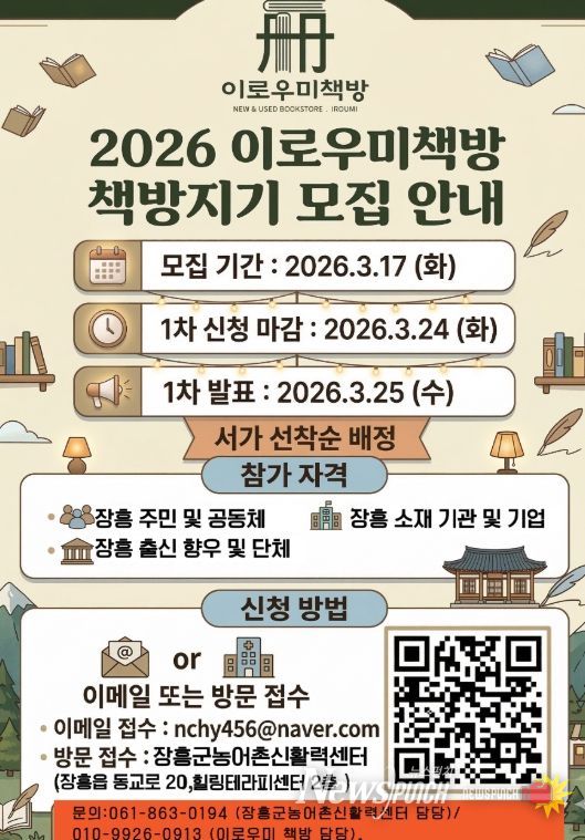 뉴스펀치 김용희 기자 | 전남 장흥의 새로운 문화 거점, 장흥힐링테라피센터에서 주민이 직접 주인으로 참여하는 혁신적인 공유서점 ‘이로우미 책방’의 첫 페이지를 함께 써 내려갈 ‘책방지기’를 모집한다.