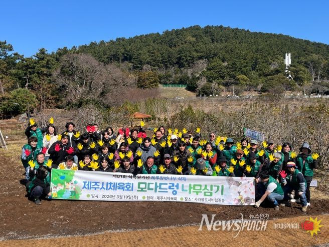 뉴스펀치 김용희 기자 | 제주시는 3월 19일 사라봉공원 도시바람길숲에서 제107회 전국체전 참가 제주시 선수단과 함께 ‘모다드렁’ 탄소중립 나무심기 행사를 진행했다.