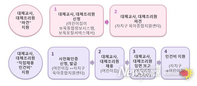 먼저 대체교사·대체조리원 파견 신청을 하고, 파견 지원이 어려운 경우엔 어린이집 직접채용 인건비 지원을 신청하면 된다.