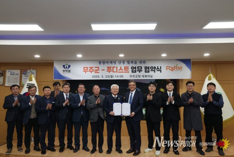 뉴스펀치 정홍균 기자 | 무주군은 지난 23일 푸디스트(주)와 농산물 통합마케팅 상생협력을 위한 업무협약을 체결했다고 밝혔다. 이날 협약식에는 황인홍 무주군수와 박성하 푸디스트(주) FSBU장을 비롯한 농협 관계자 20여 명이 참석해 의미를 더했다.