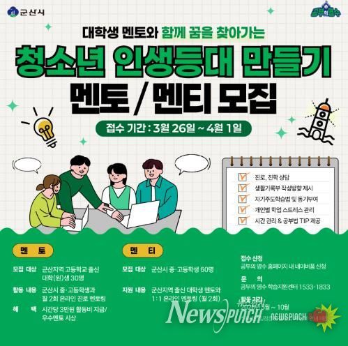 뉴스펀치 정홍균 기자 | 군산시는 관내 중·고등학생의 진로 탐색과 학습 역량 강화를 지원하기 위해 지역 출신 대학생이 참여하는 ‘청소년 인생등대 만들기’ 사업을 추진하고, 멘토와 멘티를 모집한다고 밝혔다.