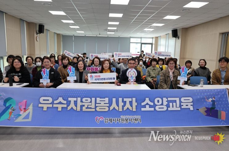 뉴스펀치 정홍균 기자 | 김제시는 김제시자원봉사센터(센터장 남궁행원)가 지난 24일, 센터 2층 대회의실에서 김제시를 대표하는 우수자원봉사자 120여 명이 참석한 가운데 “2026 우수자원봉사자 소양교육”을 실시했다고 밝혔다.