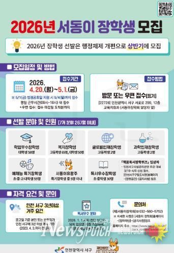 뉴스펀치 정홍균 기자 | 인천 서구 재단법인 서동이장학회는 지역 인재 양성을 위한 ‘2026년도 서동이 장학생’을 상반기에 모집한다.