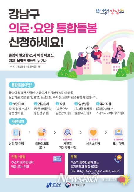 뉴스펀치 박상훈 기자 | 꿈이 모이는 도시, 미래를 그리는 강남구가 3월 27일부터 어르신과 장애인 등이 살던 곳에서 의료·요양·돌봄 서비스를 통합 지원받는 ‘강남형 통합돌봄’ 본사업을 시작한다.
