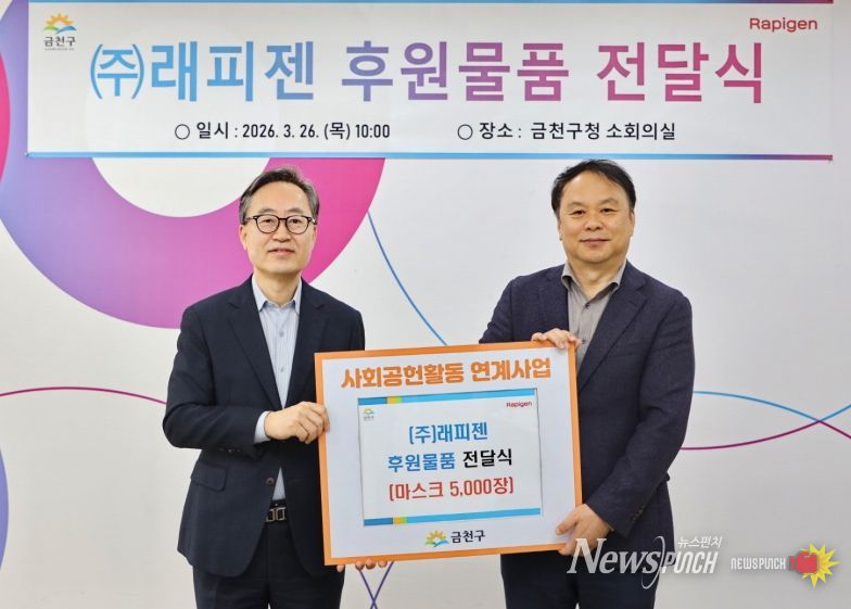 뉴스펀치 박상훈 기자 | 금천구는 ㈜래피젠으로부터 KF94 마스크 5,000장을 기부받아 지역 내 취약계층에게 전달한다고 밝혔다.