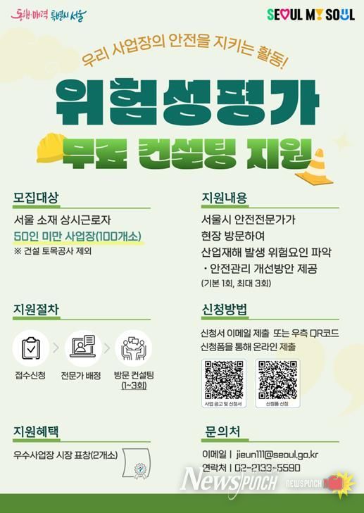 뉴스펀치 박상훈 기자 | 서울시가 산업재해에 취약한 소규모 사업장의 안전관리 강화를 위해 ‘위험성평가 무료 컨설팅’ 지원에 나선다. 복잡한 제도와 인력 부족으로 위험성평가 이행에 어려움을 겪는 사업장을 대상으로, 전문가가 직접 현장을 찾아 실질적인 개선 방안을 제공한다.