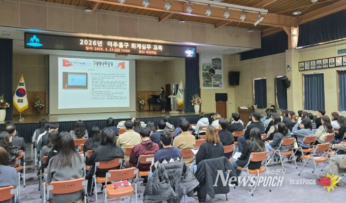 뉴스펀치 정홍균 기자 | 인천 미추홀구는 27일 구청 대회의실에서 회계 담당 공무원 100여 명을 대상으로 업무 능력 향상과 전문성 강화를 위한 ‘2026년 회계실무 교육’을 진행했다.