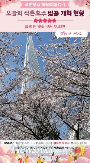 서울 송파구는 오는 4월 3일부터 11일까지 석촌호수에서 개최하는 '호수벚꽃축제'를 맞이하여, 벚꽃 개화 현황을 SNS로 실시간 중계하는 ‘벚꽃 개화 카운트다운’ 서비스를 운영한다.
