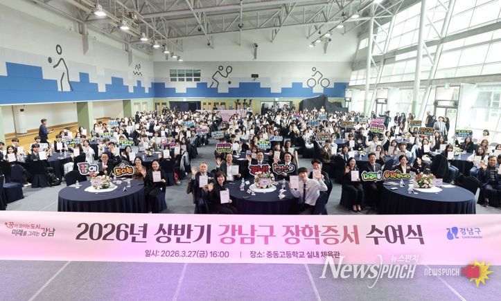 뉴스펀치 박상훈 기자 | 꿈이 모이는 도시, 미래를 그리는 강남구가 지난 27일 중동고등학교 실내체육관에서 ‘2026년 상반기 강남구 장학증서 수여식’을 열고 장학생 202명에게 총 3억7200만 원의 장학금을 전달했다.