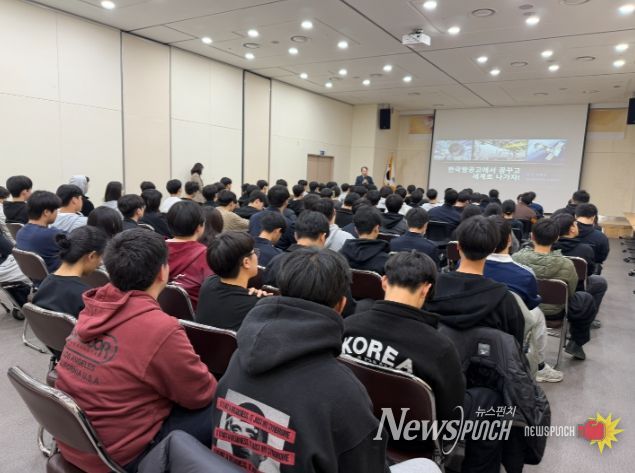 이승열 교수는 “태백에서 꿈꾸고 세계로 나아가자!”를 주제로 국내·외 항공산업의 현황과 주요 직무를 소개하고, 항공 분야 진출을 위한 진로 설계 방향과 준비 과정을 설명했다.