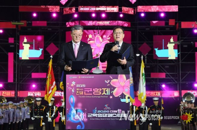 뉴스펀치 박세훈 기자 | 3월 27일 오후 7시 진해공설운동장에서 제64회 진해군항제와 2026진해군악의장페스티벌 공동개막식이 성대하게 개최됐다. 이번 개막식은 내빈 인사말씀 없이 간소화된 방식으로 진행됐으며, 특히 군악대와 의장대의 환상적이 퍼포먼스는 참석자들에게 큰 감동과 흥미를 선사했다.