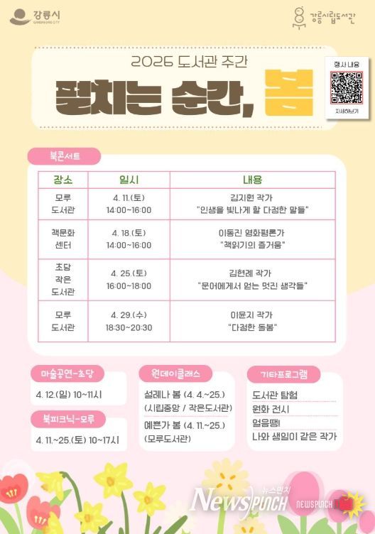 뉴스펀치 조평훈 기자 | 강릉시립도서관은 2026년 도서관 주간을 맞이하여 4월 한 달간 시민들을 위한 다채로운 독서 문화 행사를 개최한다고 밝혔다.