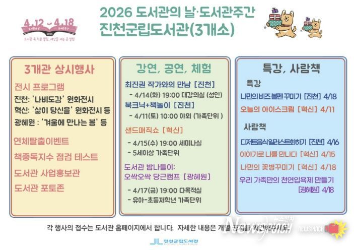뉴스펀치 이현승 기자 | 충북 진천군립도서관은 ‘2026 도서관의 날·도서관 주간’을 맞아 4월 11일부터 18일까지 관내 3개 도서관(진천군립·생거진천혁신도시·광혜원)에서 다양한 독서문화 행사를 운영한다.
