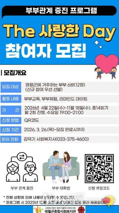 뉴스펀치 조평훈 기자 | 영월군종합사회복지관은 부부 간 소통 증진과 건강한 가족관계 형성을 위한 프로그램 ‘The 사랑한 Day’ 참여자를 모집한다.