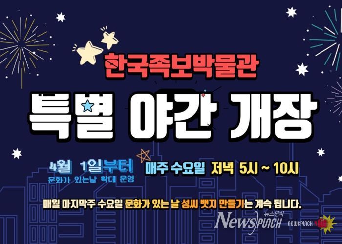 뉴스펀치 이현승 기자 | 대전 중구 한국족보박물관에서는 오는 4월 1일부터 문화체육관광부가 지정한 ‘문화가 있는 날’정책이 매달 마지막 주 수요일에서 ‘매주 수요일’로 확대됨에 따라, 관람객들이 보다 편리하게 박물관을 이용할 수 있도록 매주 수요일 밤 10시까지 특별 야간 개장을 실시한다고 밝혔다.