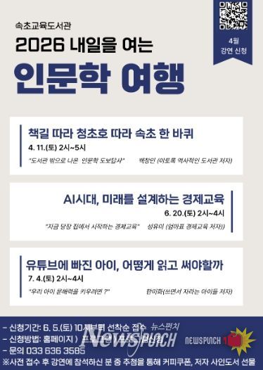 주요 프로그램은 △4월 11일 백창민 작가와 ‘책길따라, 청초호따라, 속초 한 바퀴’ △6월 20일 성유미 작가의 ‘AI시대, 미래를 설계하는 경제교육’ △7월 4일 한미화 작가의 ‘유튜브에 빠진 아이, 어떻게 읽고 써야 할까’ 등으로 구성됐다.