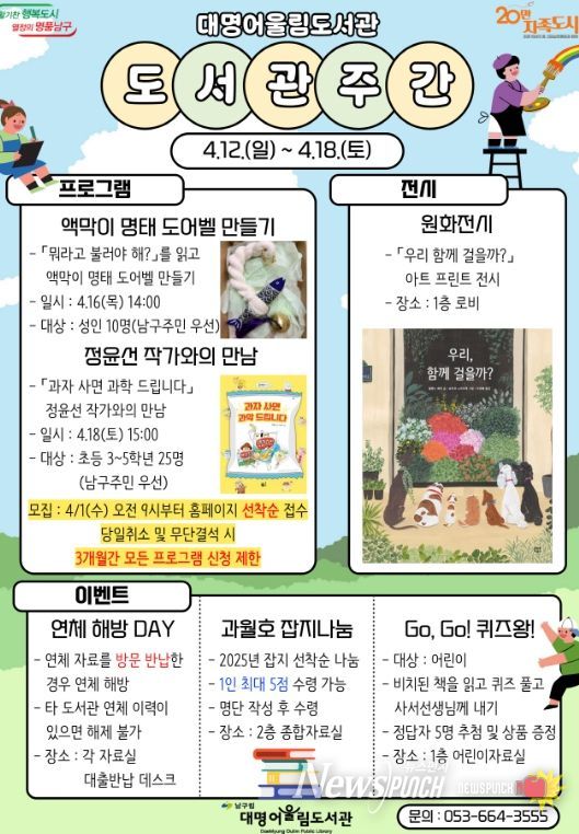 뉴스펀치 조평훈 기자 | 대구 남구립도서관은 제62회 도서관주간을 맞아 오는 4월 12일부터 4월 18일까지 다양한 독서문화행사를 운영한다고 밝혔다.