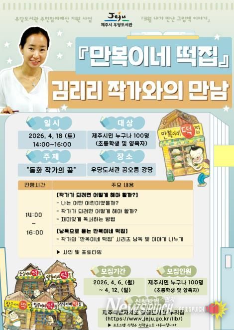 뉴스펀치 김용희 기자 | 제주시 우당도서관은 ‘책보고’ 도서대출서비스 연계 사업의 일환으로 4월 18일 오후 2시 꿈오름 강당에서 김리리 작가 초청 강연을 개최한다.