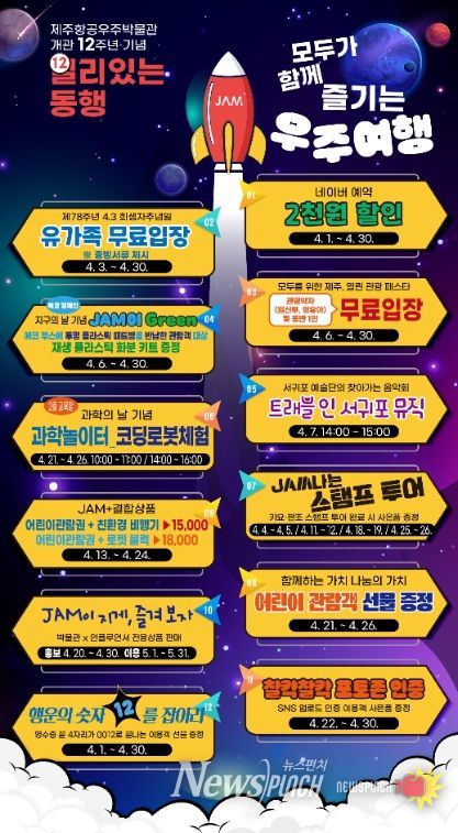 뉴스펀치 김용희 기자 | 제주국제자유도시개발센터)에서 운영하는 제주항공우주박물관은 개관 12주년을 기념하여 4월 1일부터 4월 30일까지 한달간‘일리(12) 있는 동행, 모두가 함께 즐기는 우주여행’을 주제로 특별 프로모션을 실시한다고 밝혔다.