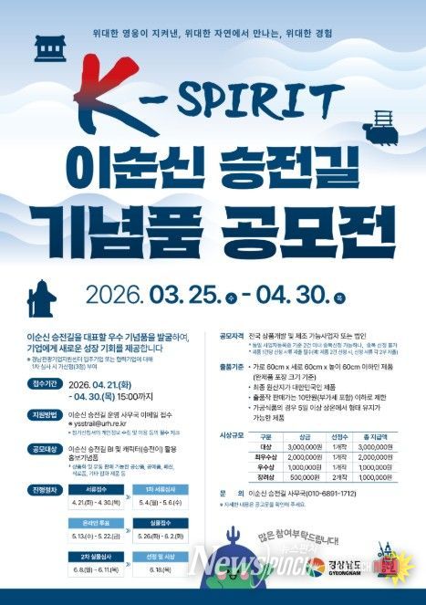 뉴스펀치 박세훈 기자 | 경상남도는 이순신 장군의 호국 정신이 깃든 ‘이순신 승전길’의 브랜드 가치를 높이고, 민간 주도의 유통·홍보체계를 구축하기 위해 ‘K-스피릿 이순신 승전길 기념품 공모전’을 개최한다고 밝혔다.