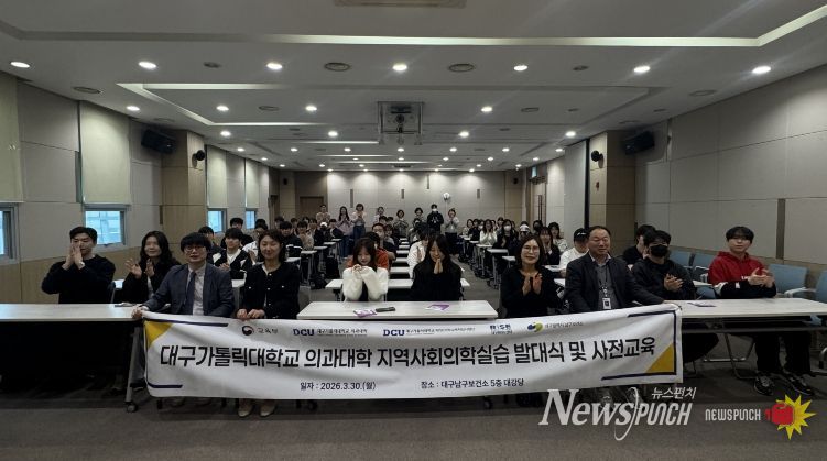 뉴스펀치 조평훈 기자 | 대구 남구보건소는 지난 30일 대구가톨릭대학교 의과대학과 지역사회 의학 발전과 주민 건강증진을 위한 업무협약(MOU)을 체결하고, 지역사회 의학실습 발대식 및 사전교육을 실시했다.