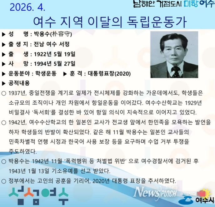 뉴스펀치 김용희 기자 | 여수시는 2026년 4월의 독립운동가로 여수 서정 출신 ‘박용수(朴容守)’ 선생을 선정했다.