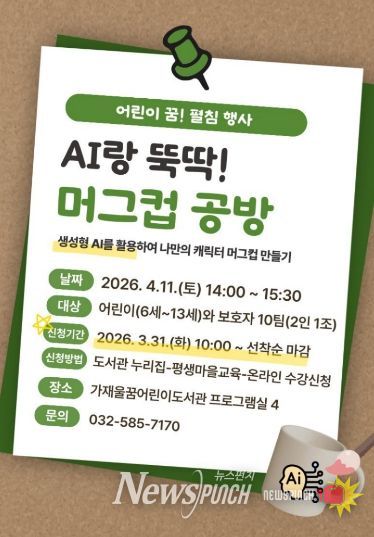 뉴스펀치 정홍균 기자 | 인천광역시교육청서구도서관은 오는 4월, 어린이를 동반한 가족이 참여하는 생성형 AI를 활용한 특별 프로그램 ‘AI랑 뚝딱! 머그컵 공방’을 운영한다.