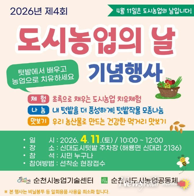 뉴스펀치 김용희 기자 | 순천시는 오는 4월 11일 오전 10시 신대도시텃밭에서 ‘2026년 제4회 도시농업의 날 기념행사’를 개최한다고 밝혔다.