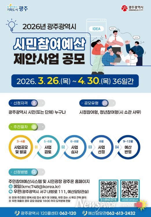 뉴스펀치 김용희 기자 | 광주광역시는 2027년도 예산 과정에 시민참여를 보장하기 위한 ‘시민참여예산 제안사업’을 4월30일까지 접수한다.