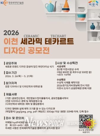 뉴스펀치 박상훈 기자 | 이천시와 한국세라믹기술원 이천분원은 ‘2026 이천 세라믹 테카르트(Ceramic Techart) 디자인 공모전’을 추진하고 3월 26일부터 5월 21일까지 접수를 진행한다.