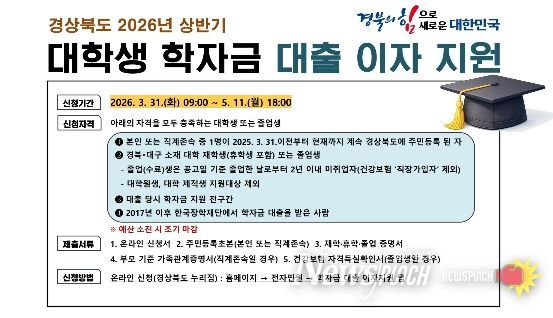 뉴스펀치 박세훈 기자 | 경북도가 도내 학자금 대출을 받은 대학생과 학자금 대출 장기 연체로 신용도 판단 정보에 등록된 사람을 대상으로 이자 지원 구간과 회복지원 범위를 확대해 경제적 부담 완화에 나선다.