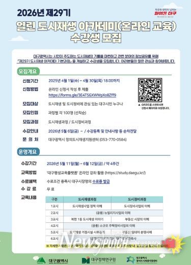 뉴스펀치 조평훈 기자 | 대구광역시는 도시재생과 정비 사업에 대한 시민들의 올바른 이해와 역량 강화를 위해 ‘제29기 열린 도시재생 아카데미 기본과정(온라인교육)’ 수강생을 모집한다.